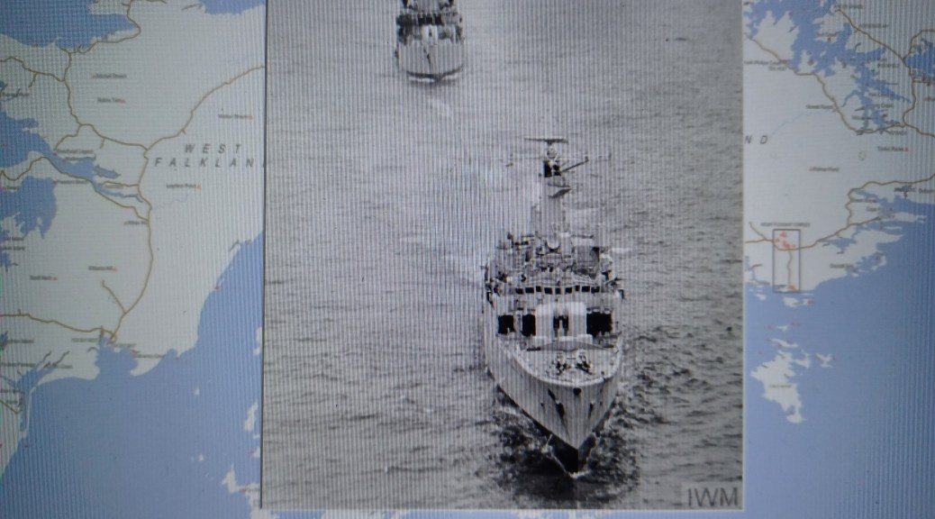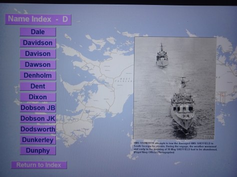 Name Index – D – (Photo Credit Royal Navy Official Photographer). HMS Yarmouth attempts to tow HMS Sheffield to South Georgia for repair. During the voyage the weather worsened and early in the morning of 10 May 1982 HMS Sheffield had to be abandoned.