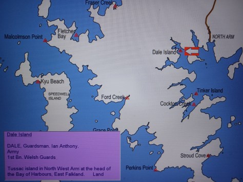 Dale Island – Guardsman Ian Anthony Dale. Army, 1st Battalion Welsh Guards. Tussac island in North West Arm at the head of the Bay of Harbours, East Falkland. Land