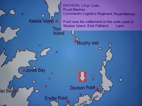 Davison Point – Lance Corporal Colin Davison. Royal Marines, Commando Logistics Regiment, Royal Marines. Point near the settlement on the north coast of Bleaker Island, East Falkland. Land.