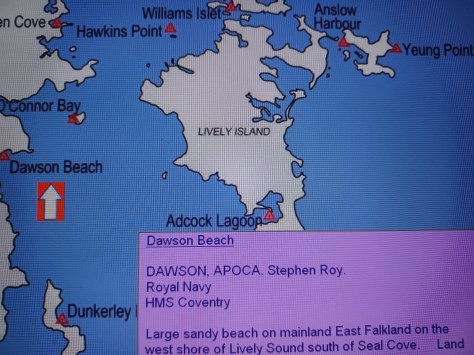 Dawson Beach – APOCA Stephen Roy Dawson. Royal Navy, HMS Coventry. Large sandy beach on mainland East Falkland on the west shore of Lively Sound south of Seal Cove. Land.