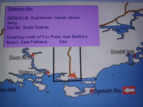 Denholm Bay – Guardsman Derek James Denholm. Army. 2nd Battalion Scots Guards. Small bay north of Fox Point, near Bertha’s Beach, East Falkland. Sea.