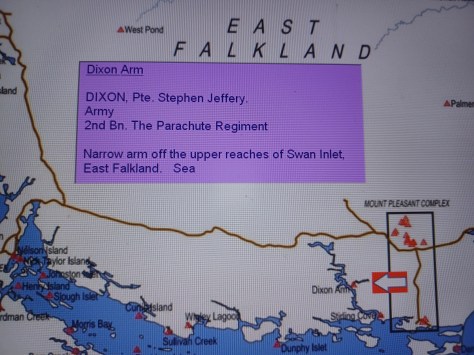 Dixon Arm – Private Stephen Jeffery. Army, 2nd Battalion The Parachute Regiment. Narrow arm off the upper reaches of Swan Inlet, East Falkland. Sea.
