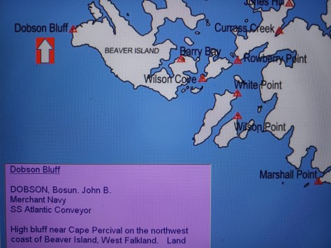 Dobson Bluff – Bosun John Benjamin Dobson. Merchant Navy, SS Atlantic Conveyor. High bluff near Cape Percival on the Northwest coast of Beaver Island, West Falkland. Land.
