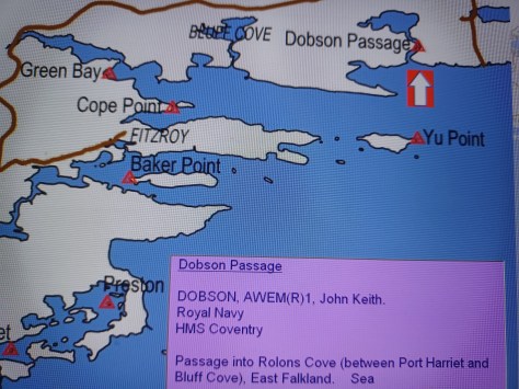 Dobson Passage – AWEM(R)1, John Keith Dobson. Royal Navy. HMS Coventry. Passage into Rolons Cove (between Port Harriet and Bluff Cove), East Falkland. Sea.
