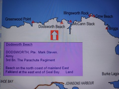 Dodsworth Beach – Private Mark Steven Dodsworth. Army, 3rd Battalion The Parachute Regiment. Beach on the north coast of mainland East Falkland at the east end of Seal Bay. Land.