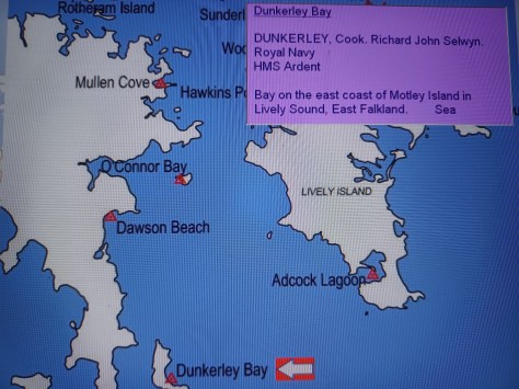 Dunkerley Bay – Cook Richard John Selwyn Dunkerley. Royal Navy, HMS Ardent. Bay on the east coast of Motley Island in Lively Sound, East Falkland. Sea.