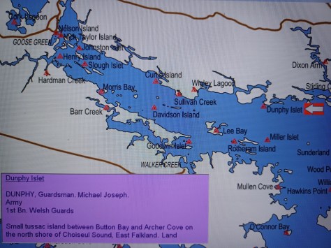 Dunphy Islet – Guardsman Michael Joseph Dunphy. Army, 1st Battalion Welsh Guards. Small tussac island between Button Bay and Archer Cove on the north shore of Choiseul Sound, East Falkland. Land.
