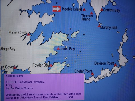 Keeble Island – Guardsman Anthony Keeble. Army, 1st Battalion Welsh Guards. Westernmost of 2 small tussac islands in Shell Bay at the entrance to Adventure Sound, East Falkland. Land.