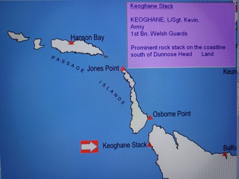 Keoghane Stack – Lance Sergeant Kevin Keoghane. Army, 1st Battalion Welsh Guards. Prominent rock stack on the coastline south of Dunnose Head. Land.