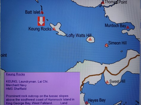 Keung Rocks – Laundryman Lai Chi Keung. Merchant Navy, HMS Sheffield. Prominent rock outcrop on the tussac slopes above the southwest coast of Hummock Island in King George Bay, West Falkland. Land.