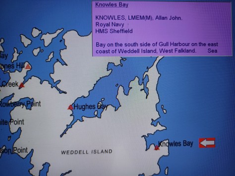 Knowles Bay – LMEM(M) Allan John Knowles. Royal Navy, HMS Sheffield. Bay on the south side of Gull Harbour on the east coast of Weddell Island, West Falkland. Sea.