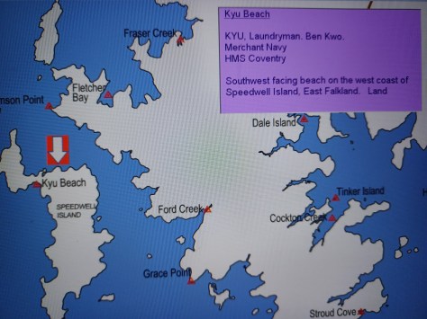 KYU Beach – Laundryman Ben Kwo Kyu. Merchant Navy, HMS Coventry. Southwest facing beach of the west coast of Speedwell Island, East Falkland. Land.