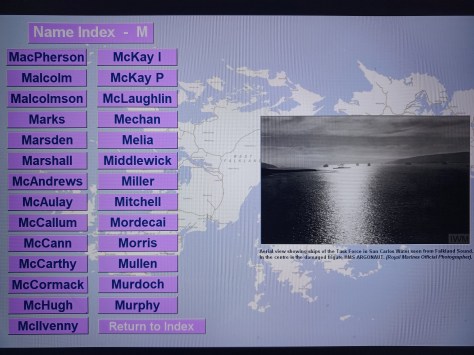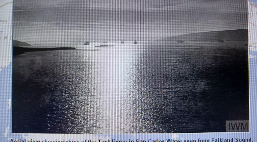 Name Index – M – (Photo Credit Royal Marines Official Photographer) – Aerial view showing ships of the Task Force in San Carlos Water seen from Falkland Sound. In the centre is the damaged frigate HMS Argonaut.