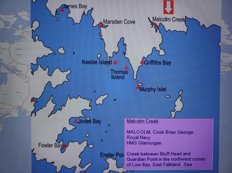 Malcolm Creek – Cook Brian George Malcolm. Royal Navy, HMS Glamorgan. Creek between Bluff Head and Guardian Point in the northwest corner of Low Bay, East Falkland. Sea.