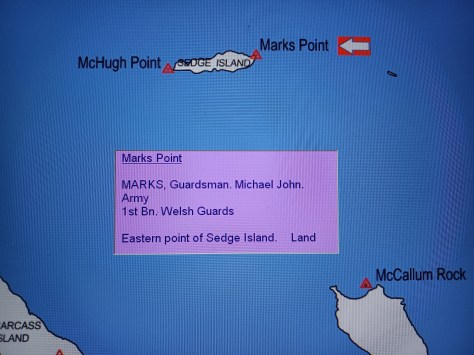 Marks Point – Guardsman Michael John Marks. Army, 1st Battalion Welsh Guards. Eastern point of Sedge Island. Land.