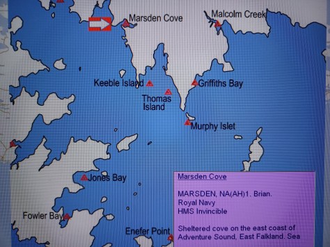 Marsden Cove – NA(AH)1 Brian Marsden. Royal Navy, HMS Invincible. Sheltered cove on the east coast of Adventure Sound, East Falkland. Sea.
