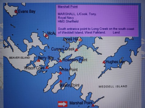 Marshall Point – L/Cook Tony Marshall. Royal Navy, HMS Sheffield. South entrance point to Long Creek on the south coast of Weddell Island, West Falkland. Land.