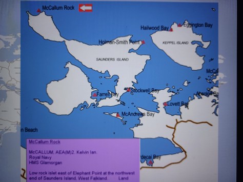 McCallum Rock – AEA(M)2 Kelvin Ian McCallum. Royal Navy, HMS Glamorgan. Low rock islet east of Elephant Point at the southwest end of Saunders Island, West Falkland. Land.