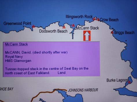 McCann Stack – David McCann (died shortly after the war). Royal Navy, HMS Glamorgan. Tussac-topped stack in the centre of Seal Bay on the north coast of East Falkland. Land.