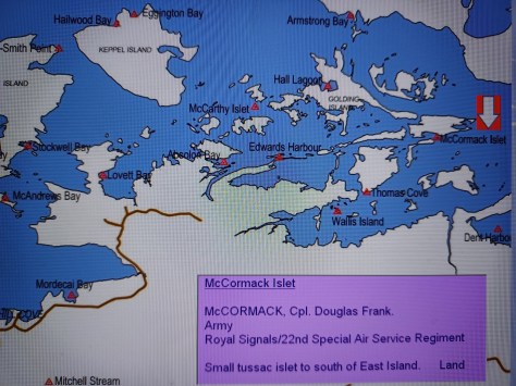 McCormack Islet – Corporal Douglas Frank McCormack. Army, Royal Signals and 22nd Special Air Service Regiment. Small tussac islet to the south of East Island. Land.