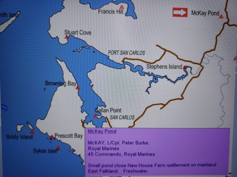 McKay Pond – Lance Corporal Peter Burke McKay. Royal Marines, 45 Commando, Royal Marines. Small pond closer to New House Farm settlement on mainland East Falkland. Freshwater.