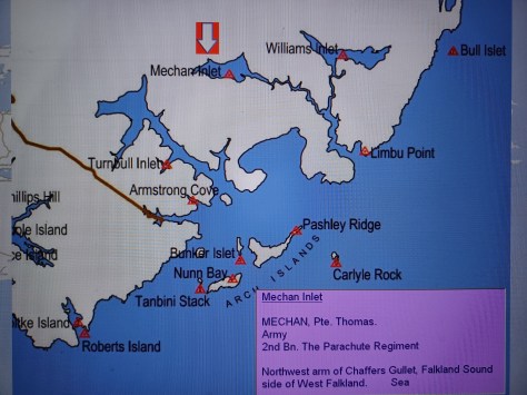 Mechan Inlet – Private Thomas Mechan. Army, 2nd Battalion The Parachute Regiment. Northwest arm of Chaffers Gullet, Falkland Sound side of West Falkland. Sea.