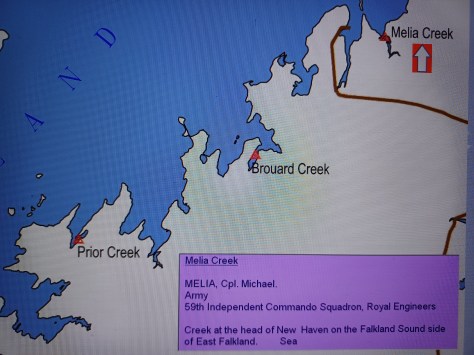 Melia Creek – Corporal Michael Melia. Army, 59th Independent Commando Squadron, Royal Engineers. Creek at the head of New Haven on the Falkland Sound side of East Falkland. Sea.