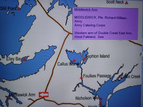 Middlewick Arm – Private Richard William Middlewick. Army, Army Catering Corps. Western Arm of Double Creek East Arm, West Falkland. Sea.
