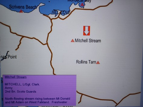 Mitchell Stream – Lance Sergeant Clark Mitchell. Army, 2nd Battalion Scots Guards. North-flowing stream rising between Mount Donald and Mount Adam on West Falkland. Freshwater.