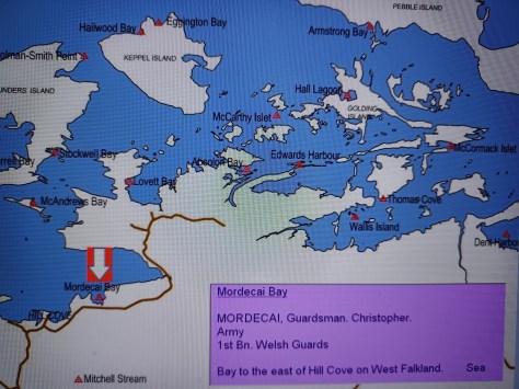 Mordecai Bay – Guardsman Christopher Mordecai. Army, 1st Battalion Welsh Guards. Bay to the east of Hill Cove on West Falkland. Sea.