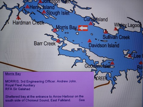 Morris Bay – 3rd Engineering Officer Andrew John Morris. Royal Fleet Auxiliary, RFA Sir Galahad. Sheltered bay at the entrance to Arrow Harbour on the south of Choiseul Sound, East Falkland. Sea.