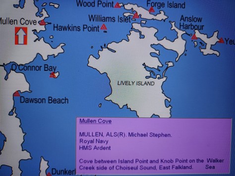 Mullen Cove – ALS(R) Michael Stephen Mullen. Royal Navy, HMS Ardent. Cove between Island Point and Knob Point on the Walker Creek side of Choiseul Sound, East Falkland. Sea.