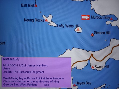 Murdoch Bay – Lance Corporal James Hamilton Murdoch. Army, 3rd Battalion The Parachute Regiment. West-facing bay at Brown Point at the entrance to Christmas Harbour on the north shore of King George Bay, West Falkland. Sea.