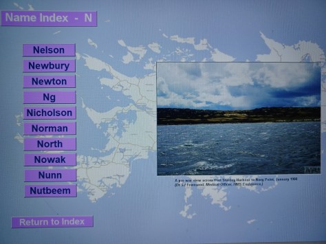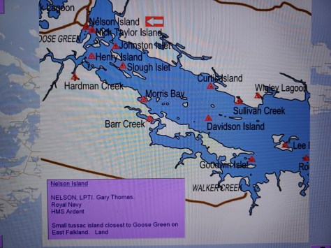 Nelson Island – LPTI Gary Thomas Nelson. Royal Navy, HMS Ardent. Small tussac island closest to Goose Green on East Falkland. Land.