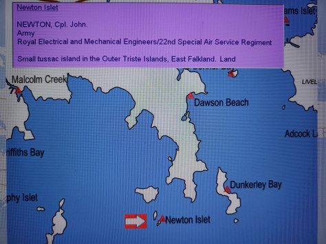 Newton Islet – Corporal John Newton. Army, Royal Electrical & Mechanical Engineers and 22nd Special Air Service Regiment. Small tussac island in the Triste Islands, East Falkland. Land.