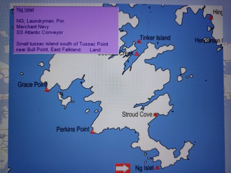 Ng Islet – Laundryman Por Ng. Merchant Navy, SS Atlantic Conveyor. Small tussac island south of Tussac Point near Bull Point, East Falkland. Land.