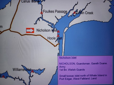 Nicholson Islet – Guardsman Gareth Duane Nicholson. Army, 1st Battalion Welsh Guards. Small tussac islet north of Whale Island in Port Edgar, West Falkland. Land.