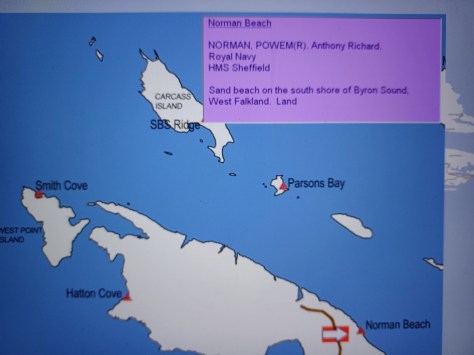 Norman Beach – POWEM(R) Anthony Richard Norman. Royal Navy, HMS Sheffield. Sand beach on the south shore of Byron Sound, West Falkland. Land.