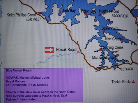 Blue Nowak Reach – Marine Michael John Nowak. Royal Marines, 45 Commando, Royal Marines. Stretch of the Malo River between the North Camp road culverts upstream to Hawk’s Nest, East Falkland. Freshwater.