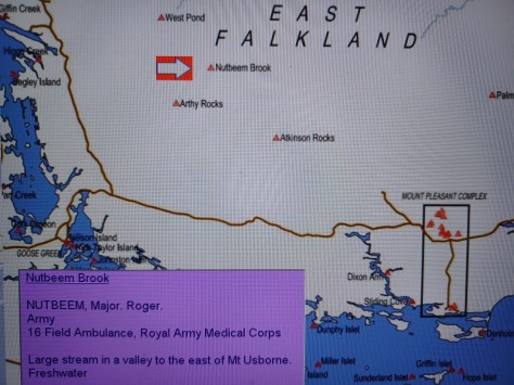 Nutbeem Brook – Major Roger Nutbeem. Army, 16 Field Ambulance, Royal Army Medical Corps. Large stream in a valley to the east of Mount Osborne. Freshwater.