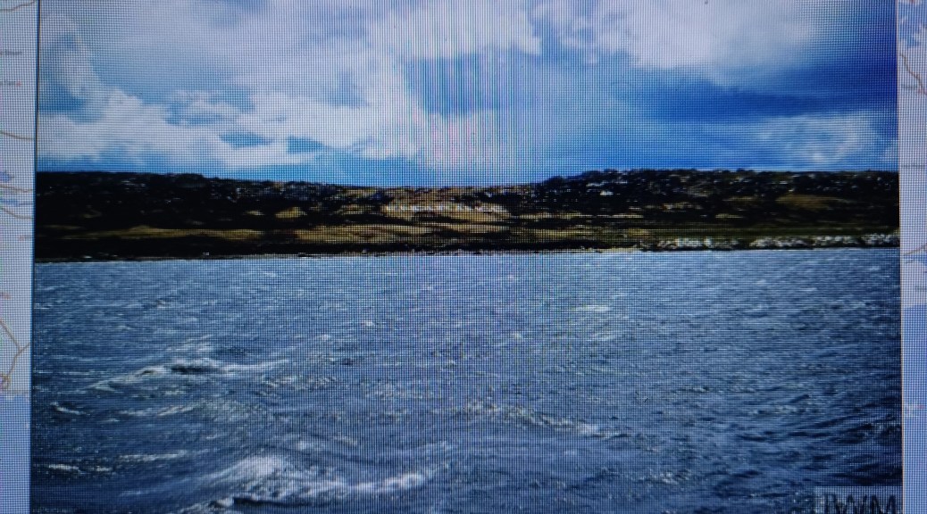North Inlet – Captain Ian Harry North DSC. Merchant Navy, SS Atlantic Conveyor. Inlet at the head of Ship Harbour on Pebble Island, West Falkland. Sea.