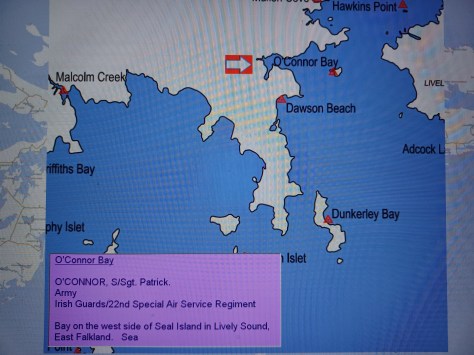 O’Connor Bay – Staff Sergeant Patrick O’Connor. Army, Irish Guards and 22nd Special Air Service Regiment. Bay on the west side of Seal Island in Lively Sound, East Falkland. Sea.