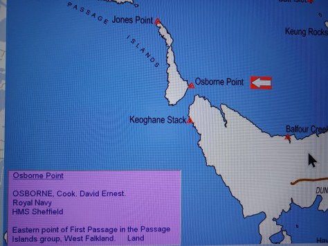 Osborne Point – Cook David Ernest Osborne. Royal Navy, HMS Sheffield. Eastern point of First Passage in the Passage Islands group, West Falkland. Land.