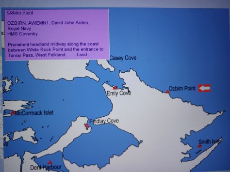 Ozbirn Point – AWEMN1 David John Arden Ozbirn. Prominent headland midway along the coast between White Rock Point and the entrance to Tamar Pass, West Falkland. Land.