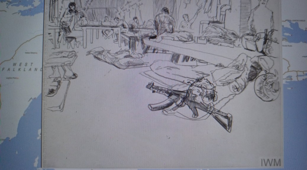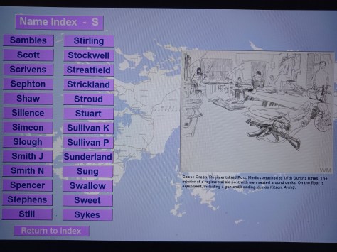 Name Index – S – (Photo Credit Linda Kitson, Artist) Goose Green Regimental Aid Post. Medics attached to 1/7th Gurkha Rifles. The interior of the RAP with men seated around desks. On the floor is equipment, including a gun and bedding.