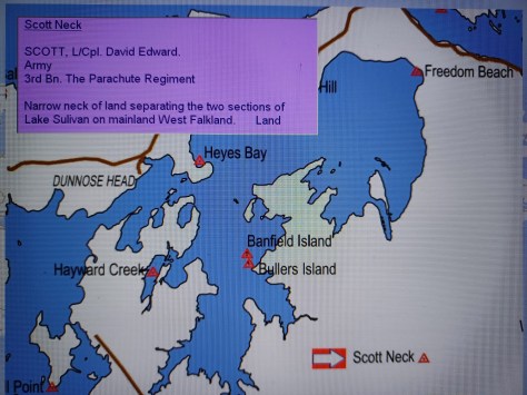 Scott Neck – Lance Corporal David Edward Scott. Army, 3rd Battalion The Parachute Regiment. Narrow neck of land separating the two sections of Lake Sullivan on mainland West Falkland. Land.