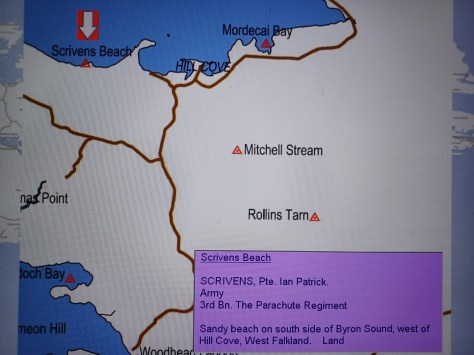 Scrivens Beach – Private Ian Patrick Scrivens. Army, 3rd Battalion The Parachute Regiment. Sandy beach on the south side of Byron Sound, west of Hill Cove, West Falkland. Land.