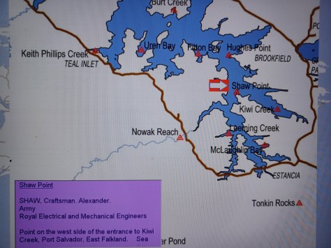 Shaw Point – Craftsman Alexander Shaw. Army, Royal Electrical and Mechanical Engineers. Point on the west side of the entrance to Kiwi Creek, Port Salvador, East Falkland. Sea.