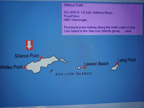 Sillence Point – L/Cook Anthony Elwyn Sillence. Royal Navy, HMS Glamorgan. Prominent point midway along the north coast of Sea Lion Island in the Sea Lion Islands group. Land.