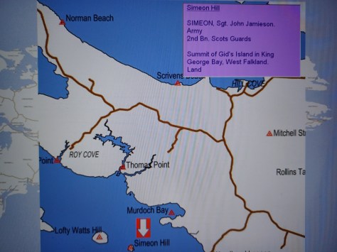 Simeon Hill – Sergeant John Jamieson Simeon. Army, 2nd Battalion Scots Guards. Summit of Gid’s Island in King George Bay, West Falkland. Land.